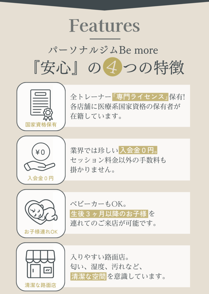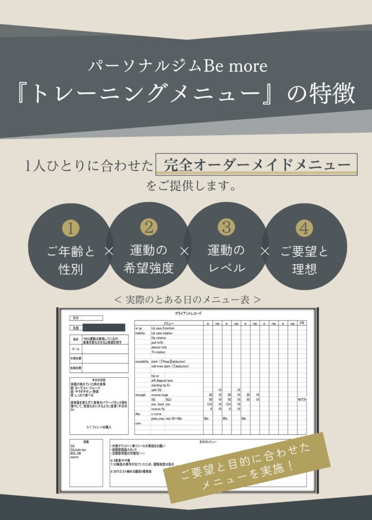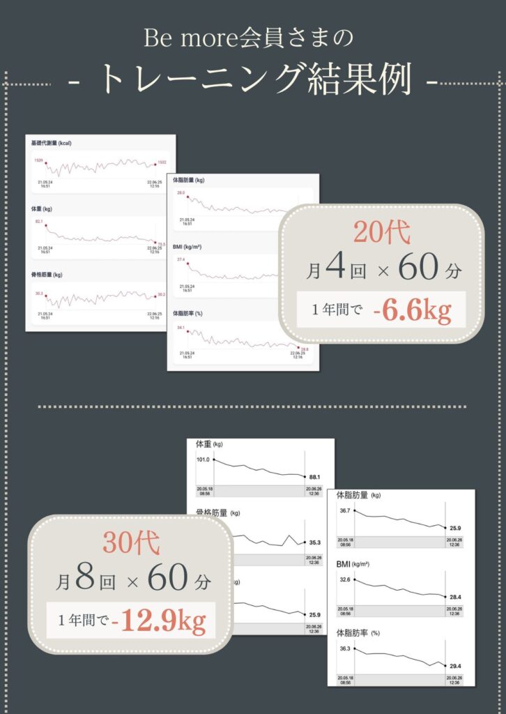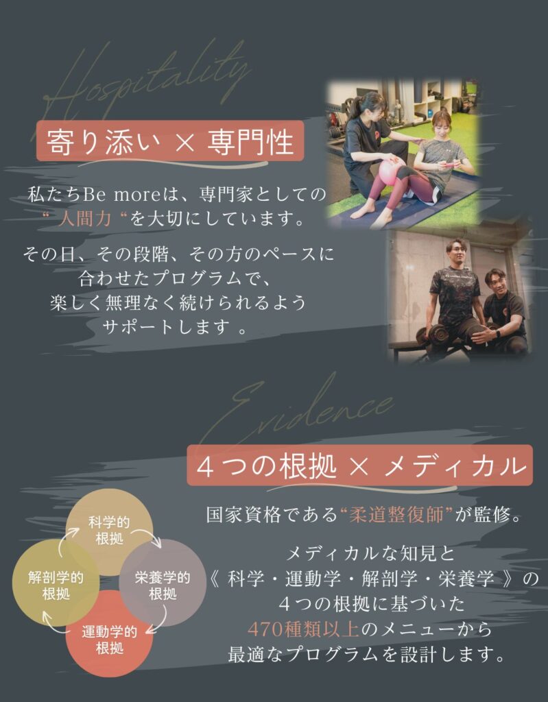 に投稿されました ああ Trustindex は、レビューの元のソースが Google であることを確認します。 いつもわかりやすく優しく教えて頂き、だんだん痩せてきたのでモチベーションがあがりました!これからもよろしくお願いします! に投稿されました りん Trustindex は、レビューの元のソースが Google であることを確認します。 年齢的にもハードなトレーニングというより筋力強化と体調管理を目的に通っているので無理のない筋トレが心地良いです。確実に出来ることが増えてきて毎週楽しみに通っています。毎週メニューが変わるのも良き!またトレーニング後のメンテナンスで癒されて1週間の疲れをリセット出来ています。駐車スペースが助かってます。 に投稿されました Takeda Vivienne Trustindex は、レビューの元のソースが Google であることを確認します。 10月から通い始めて11回目!! 我ながら『頑張ってるな💪』と言う、実感。 日に日に身体の動きがスムーズになり快適です︎💕 女性トレーナー『かなさん👧🏻💞』は、女性目線で的確にその人の弱い所を指摘し、具体的な指導が素晴らしい👏 『褒めて伸ばす』的な、やる気にさせるかなさんです💗 に投稿されました 佐々木玲奈 Trustindex は、レビューの元のソースが Google であることを確認します。 パーソナルトレーニングに通っています。 トレーニングだけでなく、女性のトレーナーが体のあれこれを丁寧に教えてくれるのでとても勉強になります。 長く通いたいです に投稿されました れよ Trustindex は、レビューの元のソースが Google であることを確認します。 夫婦ともにインドア派で、運動不足により体型が気になっていました。夫婦で一緒に通えるので、家でもトレーニングの振り返りがお互いにできます! トレーナーさんもとても優しく、アドバイスや励ましてくださるので、やる気が出るし、楽しいお話をしながらのトレーニングはキツさも感じにくくさせてもらえます。 今は大宮店にいるトレーナーさんが麻布店に移動になるそうです。正直、トレーナーさんがとてもよいので、通えるのであれば麻布店まで通いたいくらいです笑 に投稿されました はる Trustindex は、レビューの元のソースが Google であることを確認します。 自由が丘店で土倉さんに担当していただいています。 トレーニングは丁寧でわかりやすく、休憩タイムのお話も楽しいのでつい話しすぎてしまいます。 今は月4回で通っていて、土倉さんの話しやすい雰囲気のおかげで無理なく続けられています^ ^ 運動後のケアではいつも仕事でパンパンになった足のむくみをとってもらってます。 性格的に1人では運動は続かないと思うので、このジムを見つけられてよかったなと思っています もっと読み込む -Be more Movie-▼ be_more.azabu \ "根本改善"を目指す《整体つきパーソナルジム》✨/ 📍赤羽橋駅から徒歩1分! 🧘🏻♀️女性トレーナー・全スタッフ医療国家資格保有者 👶🏻お子様連れ♪大歓迎 辛い腰痛や肩凝りの改善にも! --- 🔻体験のご予約・詳細はこちら🔻 鍛える×整える アクセスしていただきありがとうございます! パーソナルジム Be more 麻布店 ジム通いの頻度は? アクセスしていただきありがとうございます! パーソナルジム Be more 麻 若さの秘訣🤫 アクセスしていただきありがとうございます! パーソナルジム Be more 麻布店で 肩こり・腰痛卒業🎓✨ アクセスしていただきありがとうございます! パーソナルジムBe more 麻 さらに読み込む Instagram でフォロー TRAINER ACCESS パーソナルジム Bemore / 麻布店 〒106-0044東京都港区東麻布1丁目 28-5-1階 営業時間平日:9:00〜20:00土日:8:00〜17:00祝日:8:00〜13:00定休日:水曜日 ○東京メトロ南北線 麻布十番駅 徒歩5分○都営地下鉄大江戸線 麻布十番駅 徒歩5分○都営地下鉄大江戸線 赤羽橋駅 徒歩1分 Tel.03-3587-1480 運営元:株式会社Be ambitious