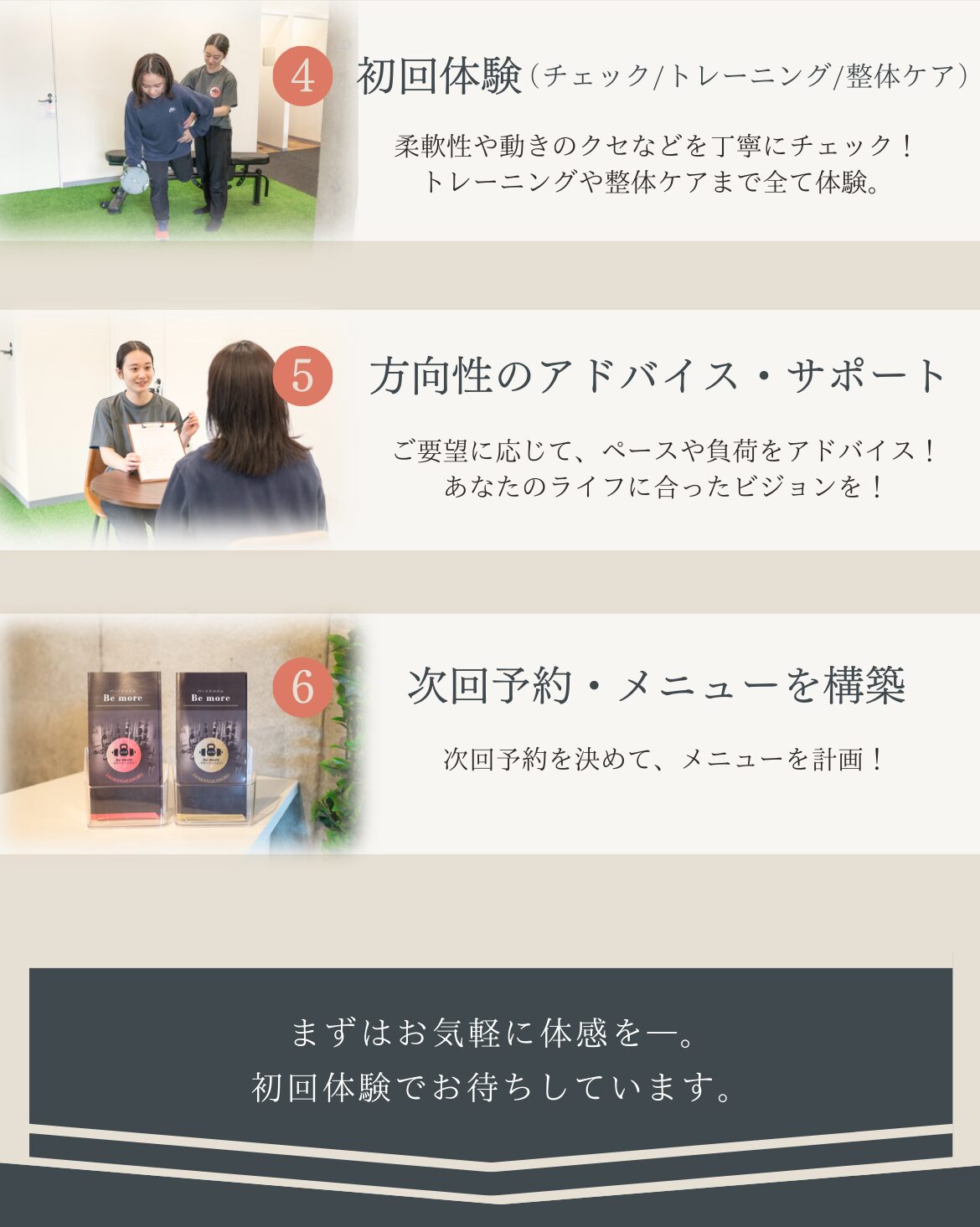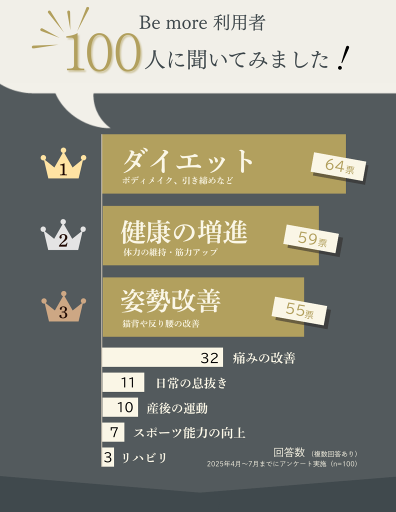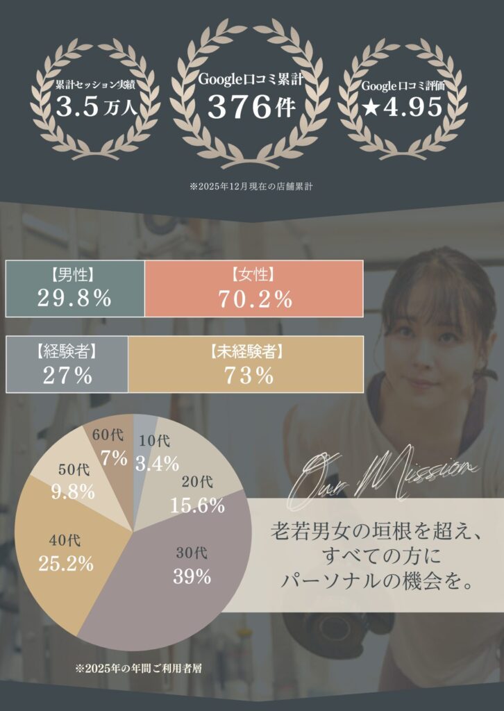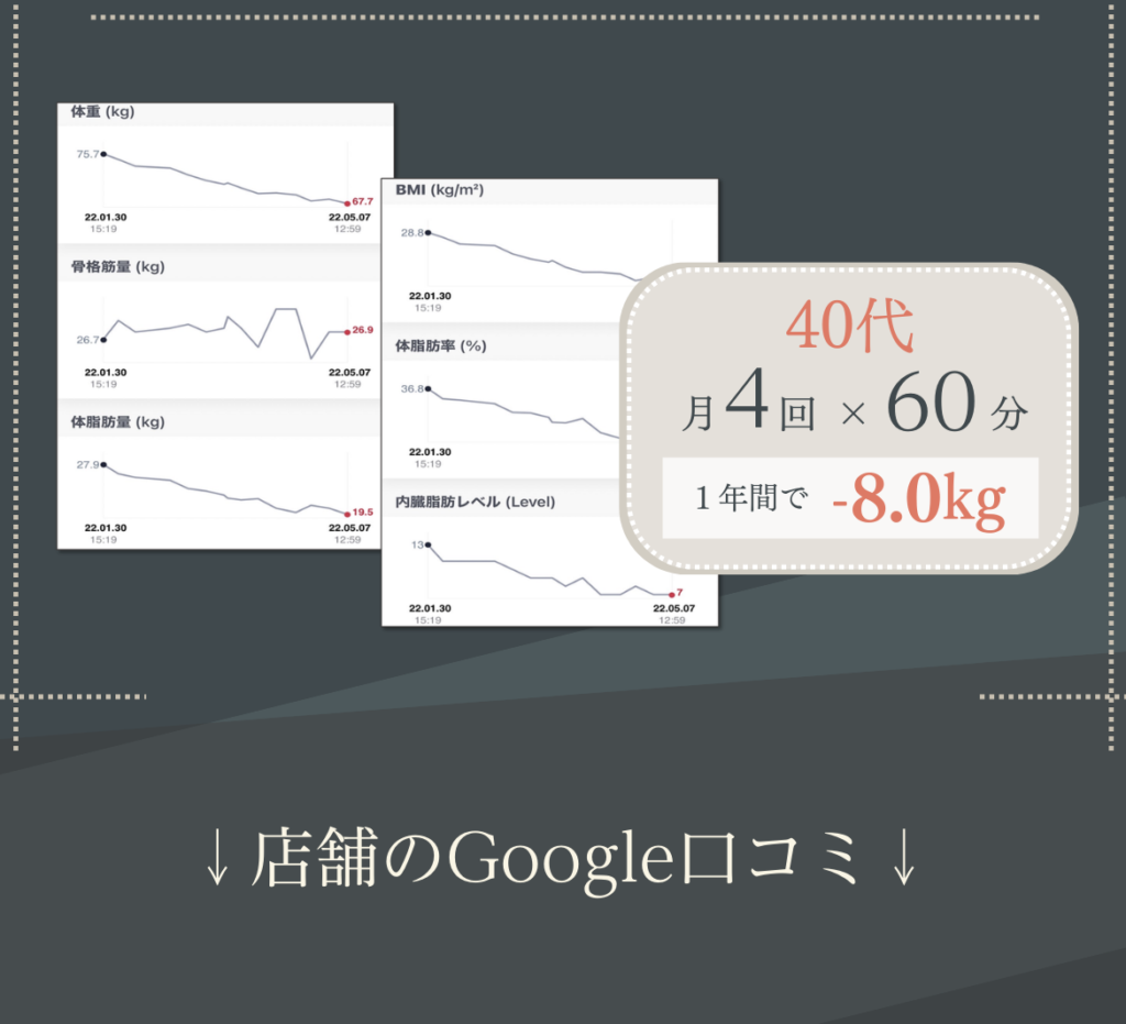に投稿されました ああ Trustindex は、レビューの元のソースが Google であることを確認します。 いつもわかりやすく優しく教えて頂き、だんだん痩せてきたのでモチベーションがあがりました!これからもよろしくお願いします! に投稿されました りん Trustindex は、レビューの元のソースが Google であることを確認します。 年齢的にもハードなトレーニングというより筋力強化と体調管理を目的に通っているので無理のない筋トレが心地良いです。確実に出来ることが増えてきて毎週楽しみに通っています。毎週メニューが変わるのも良き!またトレーニング後のメンテナンスで癒されて1週間の疲れをリセット出来ています。駐車スペースが助かってます。 に投稿されました Takeda Vivienne Trustindex は、レビューの元のソースが Google であることを確認します。 10月から通い始めて11回目!! 我ながら『頑張ってるな💪』と言う、実感。 日に日に身体の動きがスムーズになり快適です︎💕 女性トレーナー『かなさん👧🏻💞』は、女性目線で的確にその人の弱い所を指摘し、具体的な指導が素晴らしい👏 『褒めて伸ばす』的な、やる気にさせるかなさんです💗 に投稿されました 佐々木玲奈 Trustindex は、レビューの元のソースが Google であることを確認します。 パーソナルトレーニングに通っています。 トレーニングだけでなく、女性のトレーナーが体のあれこれを丁寧に教えてくれるのでとても勉強になります。 長く通いたいです に投稿されました れよ Trustindex は、レビューの元のソースが Google であることを確認します。 夫婦ともにインドア派で、運動不足により体型が気になっていました。夫婦で一緒に通えるので、家でもトレーニングの振り返りがお互いにできます! トレーナーさんもとても優しく、アドバイスや励ましてくださるので、やる気が出るし、楽しいお話をしながらのトレーニングはキツさも感じにくくさせてもらえます。 今は大宮店にいるトレーナーさんが麻布店に移動になるそうです。正直、トレーナーさんがとてもよいので、通えるのであれば麻布店まで通いたいくらいです笑 に投稿されました はる Trustindex は、レビューの元のソースが Google であることを確認します。 自由が丘店で土倉さんに担当していただいています。 トレーニングは丁寧でわかりやすく、休憩タイムのお話も楽しいのでつい話しすぎてしまいます。 今は月4回で通っていて、土倉さんの話しやすい雰囲気のおかげで無理なく続けられています^ ^ 運動後のケアではいつも仕事でパンパンになった足のむくみをとってもらってます。 性格的に1人では運動は続かないと思うので、このジムを見つけられてよかったなと思っています もっと読み込む -Be more Movie-▼ be_more.azabu \ "根本改善"を目指す《整体つきパーソナルジム》✨/ 📍赤羽橋駅から徒歩1分! 🧘🏻♀️女性トレーナー・全スタッフ医療国家資格保有者 👶🏻お子様連れ♪大歓迎 辛い腰痛や肩凝りの改善にも! --- 🔻体験のご予約・詳細はこちら🔻 鍛える×整える アクセスしていただきありがとうございます! パーソナルジム Be more 麻布店 ジム通いの頻度は? アクセスしていただきありがとうございます! パーソナルジム Be more 麻 若さの秘訣🤫 アクセスしていただきありがとうございます! パーソナルジム Be more 麻布店で 肩こり・腰痛卒業🎓✨ アクセスしていただきありがとうございます! パーソナルジムBe more 麻 さらに読み込む Instagram でフォロー TRAINER ACCESS パーソナルジム Bemore / 麻布店 〒106-0044東京都港区東麻布1丁目 28-5-1階 営業時間平日:9:00〜20:00土日:8:00〜17:00祝日:8:00〜13:00定休日:水曜日 ○東京メトロ南北線 麻布十番駅 徒歩5分○都営地下鉄大江戸線 麻布十番駅 徒歩5分○都営地下鉄大江戸線 赤羽橋駅 徒歩1分 Tel.03-3587-1480 運営元:株式会社Be ambitious