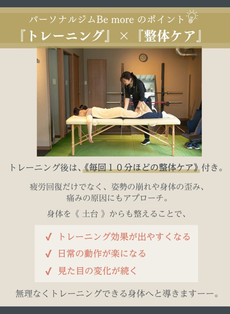に投稿されました ああ Trustindex は、レビューの元のソースが Google であることを確認します。 いつもわかりやすく優しく教えて頂き、だんだん痩せてきたのでモチベーションがあがりました!これからもよろしくお願いします! に投稿されました りん Trustindex は、レビューの元のソースが Google であることを確認します。 年齢的にもハードなトレーニングというより筋力強化と体調管理を目的に通っているので無理のない筋トレが心地良いです。確実に出来ることが増えてきて毎週楽しみに通っています。毎週メニューが変わるのも良き!またトレーニング後のメンテナンスで癒されて1週間の疲れをリセット出来ています。駐車スペースが助かってます。 に投稿されました Takeda Vivienne Trustindex は、レビューの元のソースが Google であることを確認します。 10月から通い始めて11回目!! 我ながら『頑張ってるな💪』と言う、実感。 日に日に身体の動きがスムーズになり快適です︎💕 女性トレーナー『かなさん👧🏻💞』は、女性目線で的確にその人の弱い所を指摘し、具体的な指導が素晴らしい👏 『褒めて伸ばす』的な、やる気にさせるかなさんです💗 に投稿されました 佐々木玲奈 Trustindex は、レビューの元のソースが Google であることを確認します。 パーソナルトレーニングに通っています。 トレーニングだけでなく、女性のトレーナーが体のあれこれを丁寧に教えてくれるのでとても勉強になります。 長く通いたいです に投稿されました れよ Trustindex は、レビューの元のソースが Google であることを確認します。 夫婦ともにインドア派で、運動不足により体型が気になっていました。夫婦で一緒に通えるので、家でもトレーニングの振り返りがお互いにできます! トレーナーさんもとても優しく、アドバイスや励ましてくださるので、やる気が出るし、楽しいお話をしながらのトレーニングはキツさも感じにくくさせてもらえます。 今は大宮店にいるトレーナーさんが麻布店に移動になるそうです。正直、トレーナーさんがとてもよいので、通えるのであれば麻布店まで通いたいくらいです笑 に投稿されました はる Trustindex は、レビューの元のソースが Google であることを確認します。 自由が丘店で土倉さんに担当していただいています。 トレーニングは丁寧でわかりやすく、休憩タイムのお話も楽しいのでつい話しすぎてしまいます。 今は月4回で通っていて、土倉さんの話しやすい雰囲気のおかげで無理なく続けられています^ ^ 運動後のケアではいつも仕事でパンパンになった足のむくみをとってもらってます。 性格的に1人では運動は続かないと思うので、このジムを見つけられてよかったなと思っています もっと読み込む -Be more Movie-▼ be_more.azabu \ "根本改善"を目指す《整体つきパーソナルジム》✨/ 📍赤羽橋駅から徒歩1分! 🧘🏻♀️女性トレーナー・全スタッフ医療国家資格保有者 👶🏻お子様連れ♪大歓迎 辛い腰痛や肩凝りの改善にも! --- 🔻体験のご予約・詳細はこちら🔻 好きな服が似合う身体✨ アクセスしていただきありがとうございます! パーソナルジム Be more 初めてのジムはBe moreへ✨ アクセスしていただきありがとうございます! パーソナルジム Be 産前のお悩みも! アクセスしていただきありがとうございます! パーソナルジム Be more 麻布 新しい自分へ変わる春🌸 アクセスしていただきありがとうございます! パーソナルジム Be more さらに読み込む Instagram でフォロー TRAINER ACCESS パーソナルジム Bemore / 麻布店 〒106-0044東京都港区東麻布1丁目 28-5-1階 営業時間平日:9:00〜20:00土日:8:00〜17:00祝日:8:00〜13:00定休日:水曜日 ○東京メトロ南北線 麻布十番駅 徒歩5分○都営地下鉄大江戸線 麻布十番駅 徒歩5分○都営地下鉄大江戸線 赤羽橋駅 徒歩1分 Tel.03-3587-1480 運営元:株式会社Be ambitious